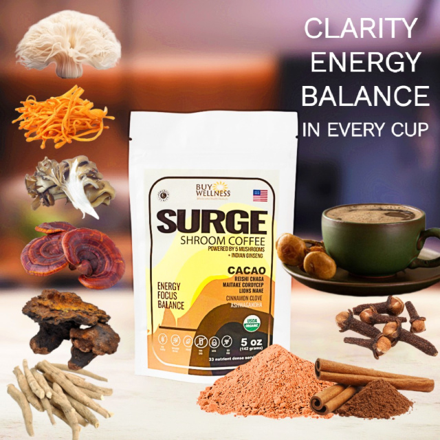 IF you crave Coffee but hate the jitters; you love Chocolate but not the fat then - DRINK SURGE ! A Power Mushroom Beverage and a substitue for Coffee contains Organic Raw Cacao, 5 Nutrient Dense Organic Mushrooms (Chaga, Reishi, Cordyceps, Lions Mane and Maitake) and Organic Ashwagandha, Cinnamon and Clove.